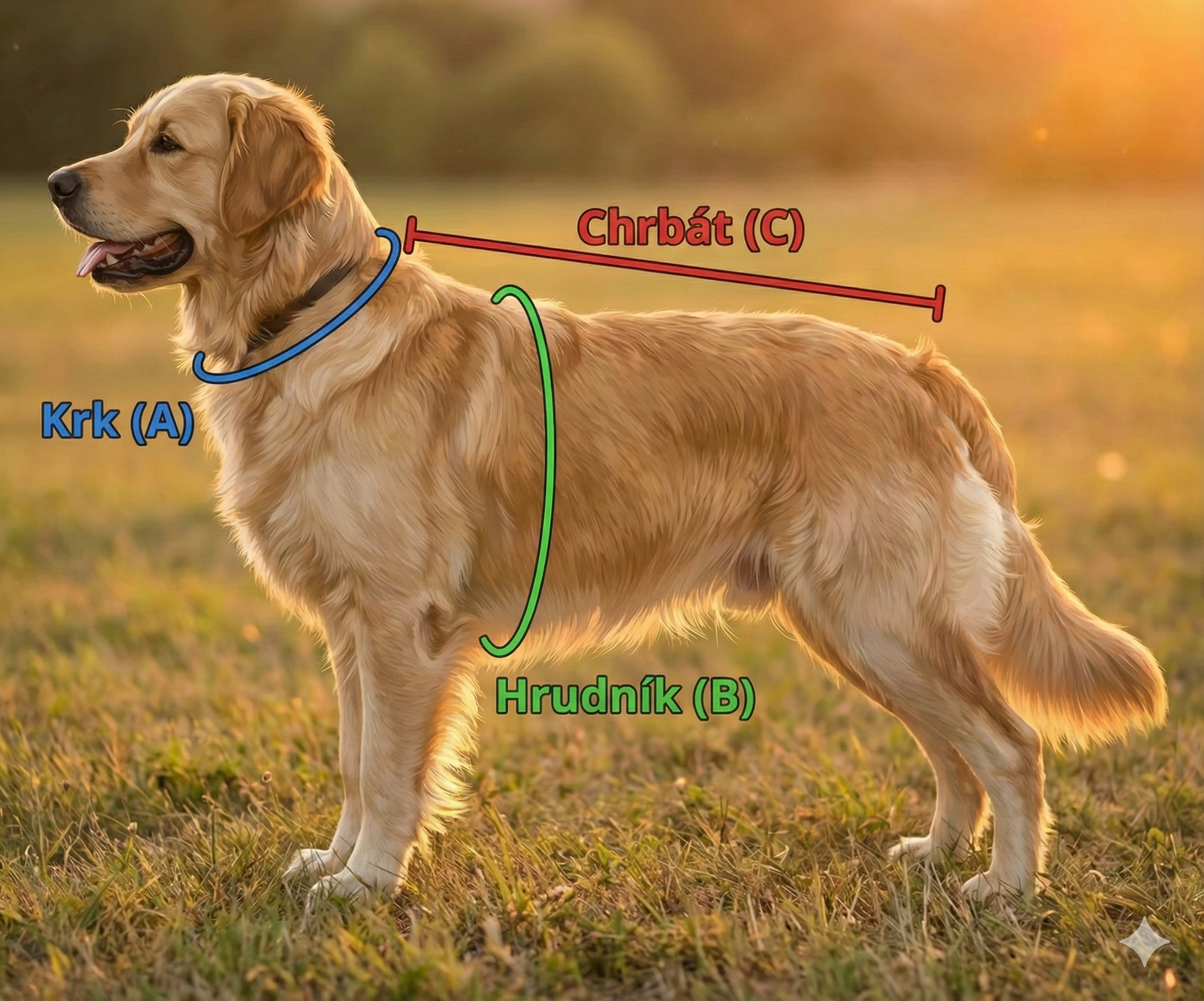 - Obvod krku: Merajte v najširšom bode krku, nižšie, než sa nosí obojok (smerom k pleciam).