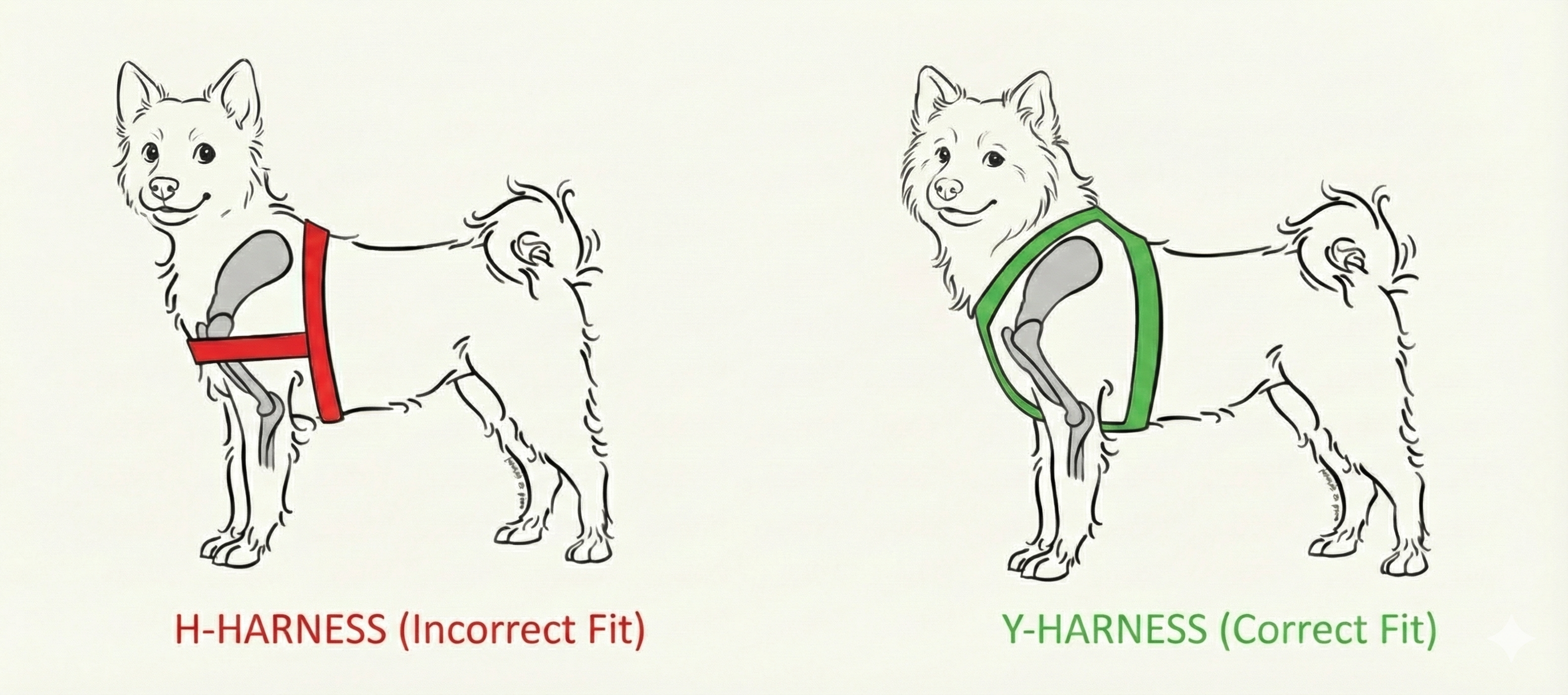 Popruhy okolo krku tvoria tvar písmena Y a hrudný popruh prechádza medzi prednými nohami.