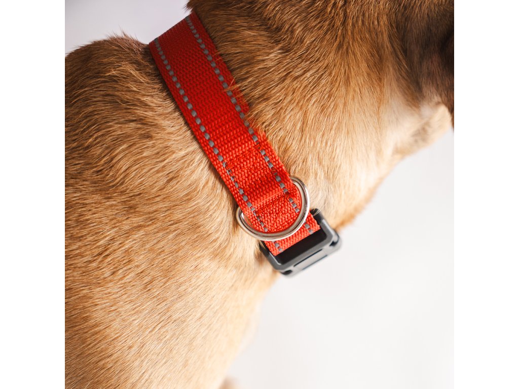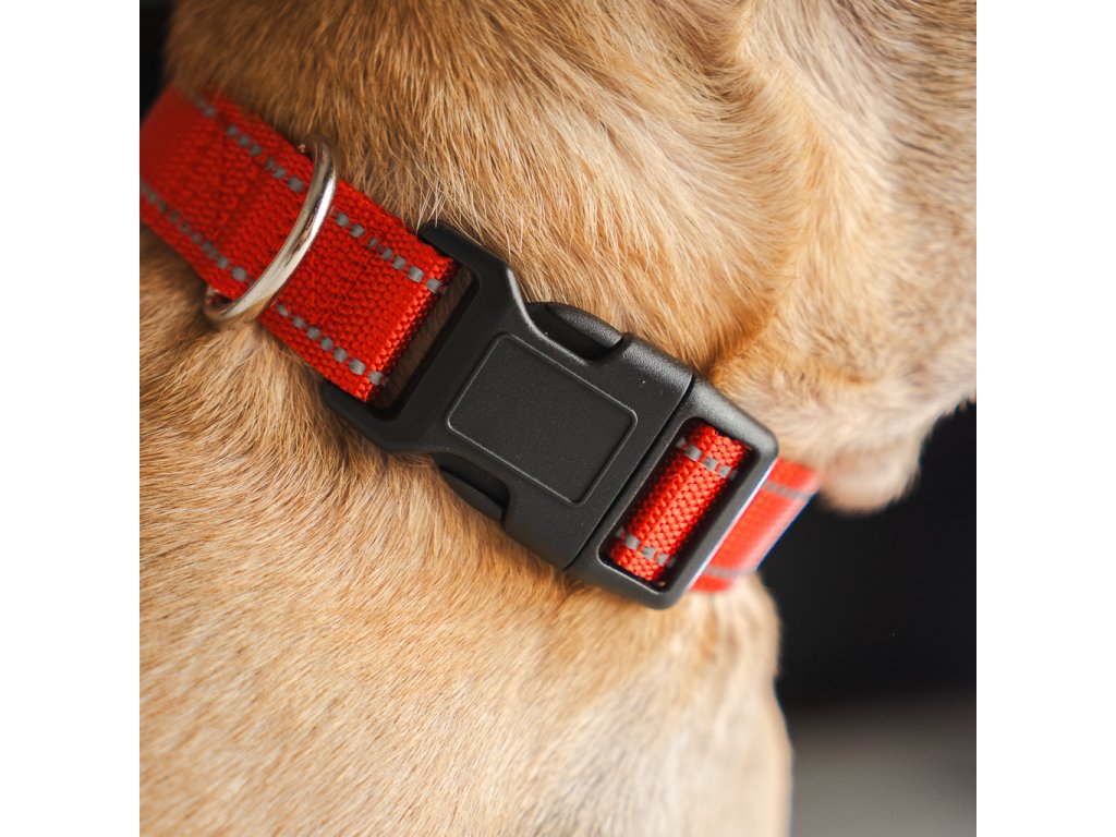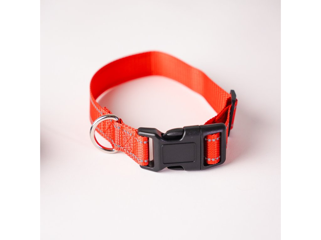Praktický nylonový obojok s reflexnými prvkami v červenej farbe, rýchlosponou a kovovým očkom na vodítko – vhodný pre psov všetkých veľkostí.