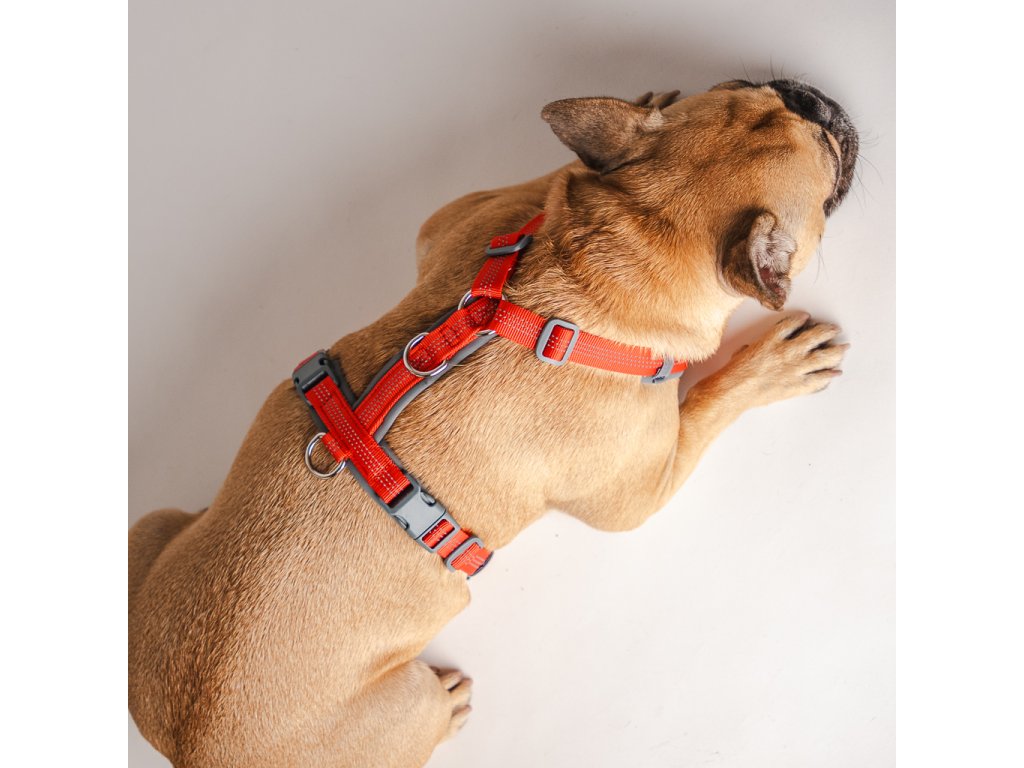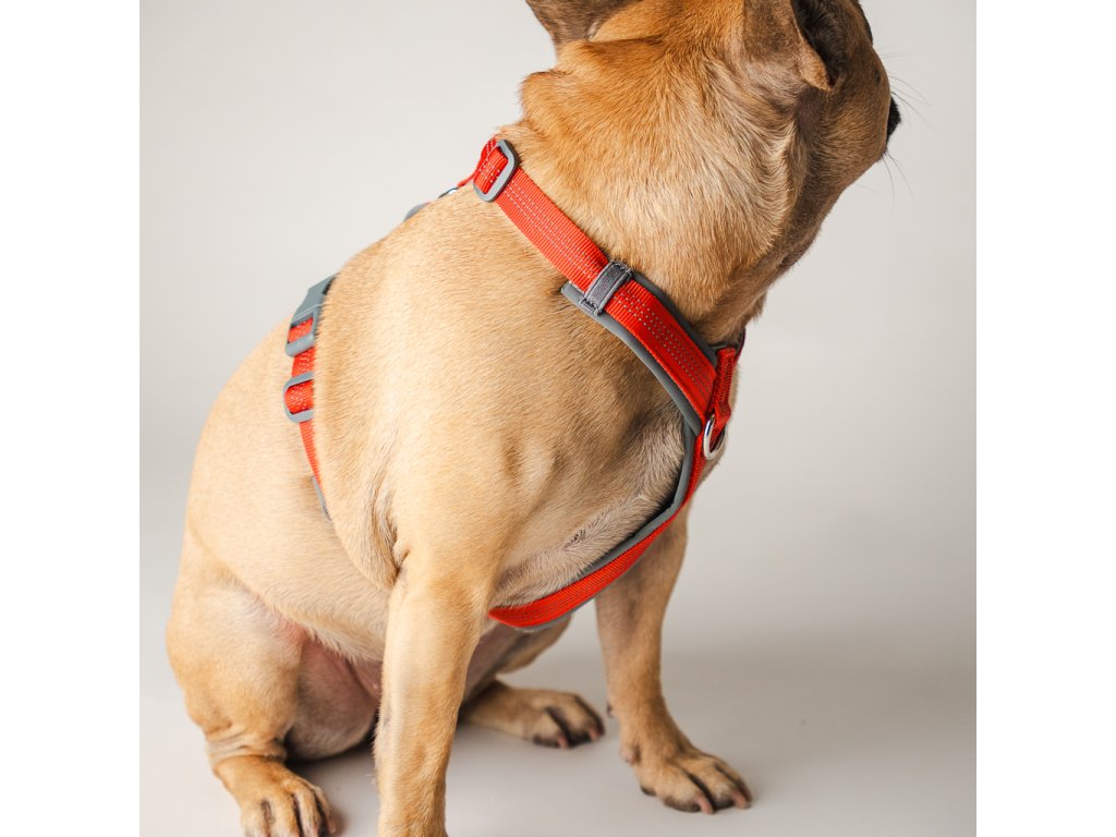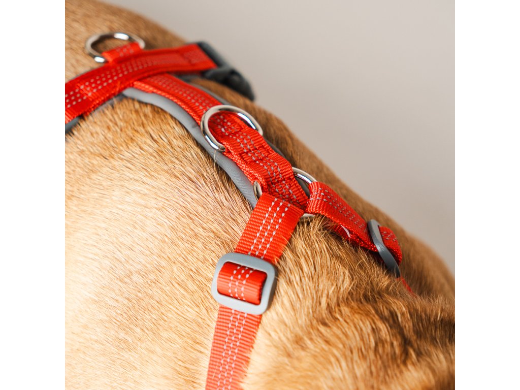 Z vnútornej strany je postroj vybavený mäkkým neoprénom, ktorý zabraňuje odieraniu srsti a zvyšuje pohodlie aj pri dlhšom nosení. Reflexné pásy po celom obvode zvyšujú bezpečnosť počas večerných prechádzok.