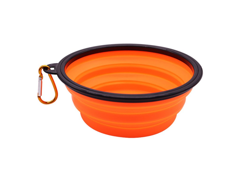 Praktická oranžová miska pre psa s karabínou, ktorú jednoducho zložíš do plochého tvaru – ideálna na cestovanie, výlety a aktívne dni.